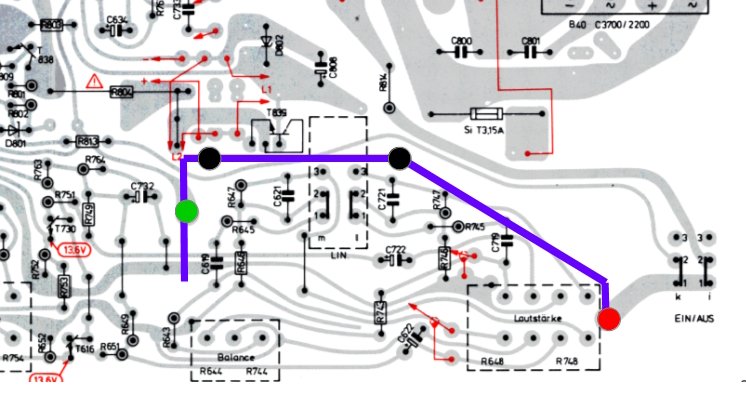 den nachträglich von Grundig am Netzschalter auf der Leiterbahnseite über die unterbrochene Leiterbahn zu R814 eingebauten PTC C970 (Kaltleiter) habe ich auch gesehen. Der PTC C970 ist eine Überstrombegrenzung, die R814 schützt. Der ist hier schon mal besprochen worden? Da muss ich mal suchen!