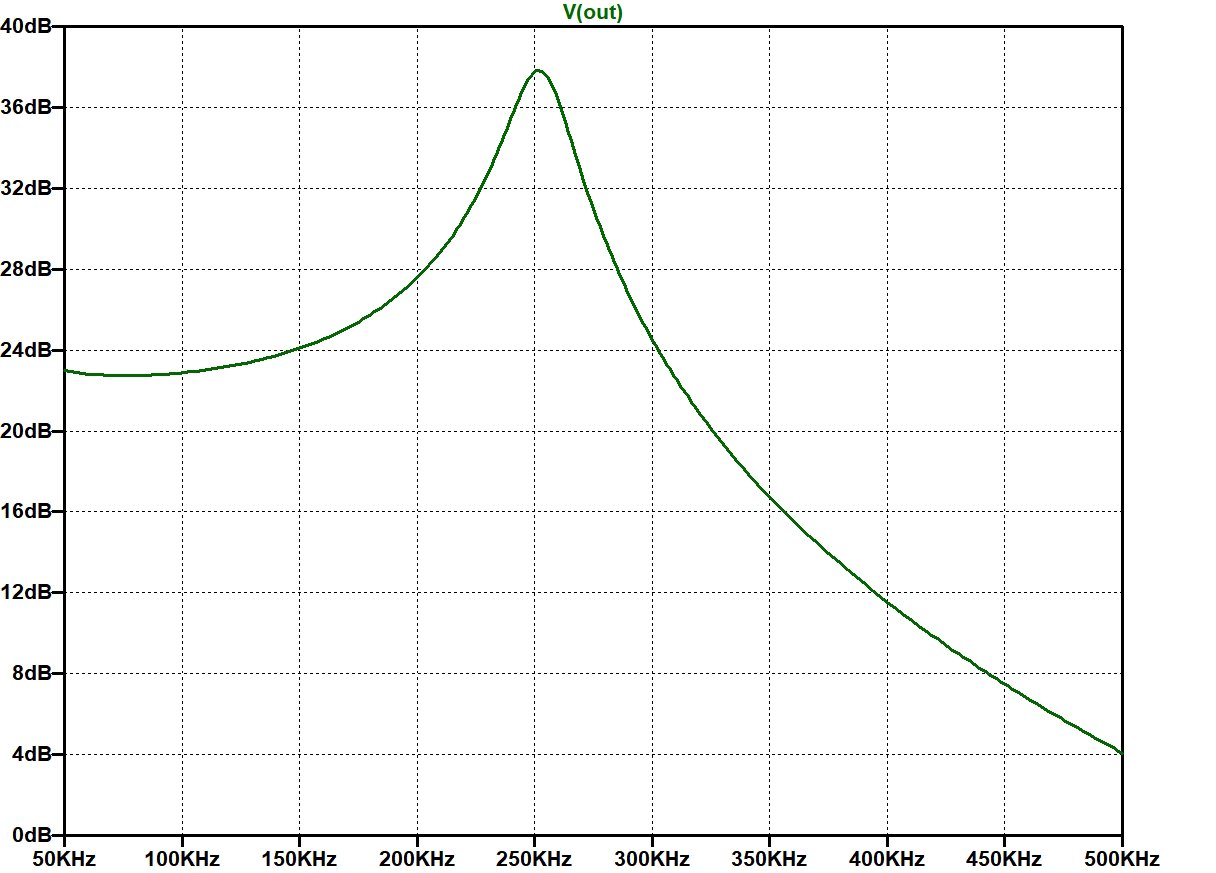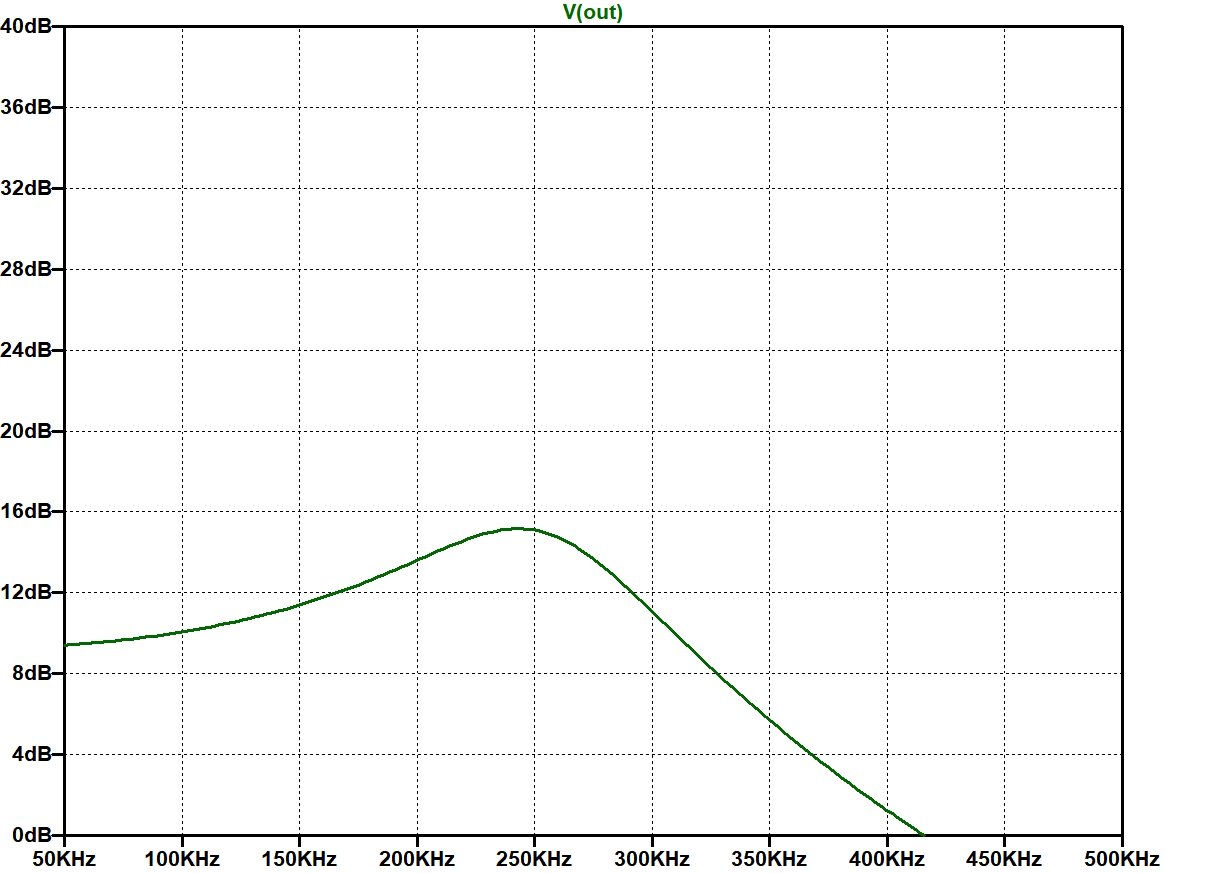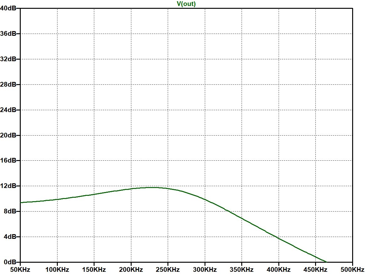 Schwingungsamplitude bei Höhensteller auf "Mitte" und mit intaktem C2: Die "normale" Verstärkung bei Höhensteller auf "Mitte" mit intaktem C2 beträgt unter den genannten Bedingungen ca. 9 dB bei 250 kHz. Dazu kommt in der Simulation eine Erhöhung von ca. 3 dB aufgrund nicht perfekter Kompensation in der GK, zusammen 12 dB.