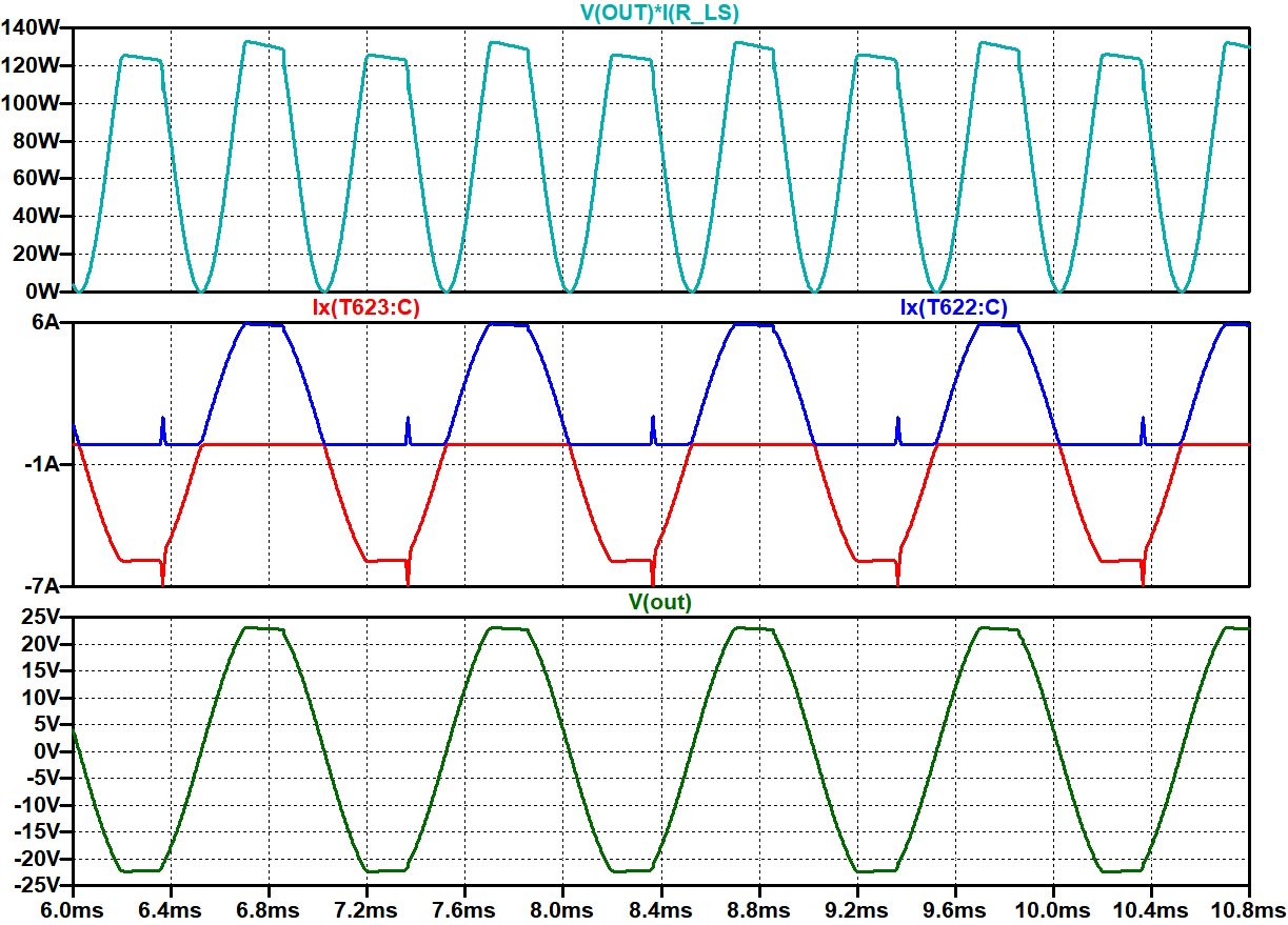 Kollektorströme der Endtransistoren verdoppeln sich dabei auf ca. 2,7 A rms. Das ist gerade noch im sicheren Betriebsbereich (SOA)nach Datenblatt BDW93 / BDW94. Die CE-Spannung jedes der beiden Endtransistoren liegt dabei an der halben Betriebsspannung, hier also UCE=22 V.