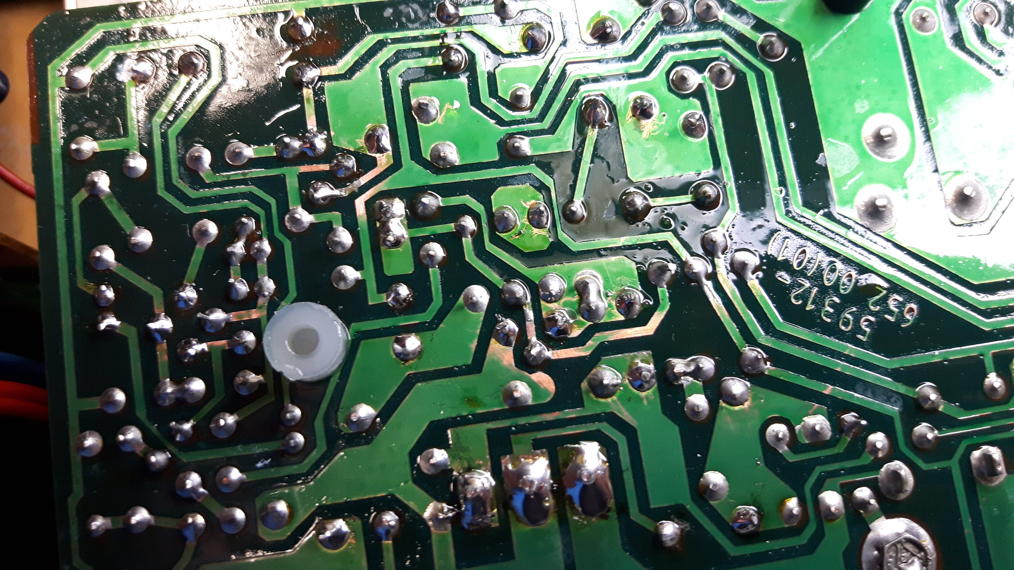 Ganz offensichtlich gab es ein Problem mit hohen Strömen, also vermutlich einem Kurzschluß, der wohl auch an den entsprechend freigekratzten Lötstellen vermutet wurde. (Photo entstand nach der Platinenreinigung) Nach dem Ersetzen der defekten Teile, wobei die Motorola Typen durch BC 639 ersetzt wurden (PIN Belegung beachten), fuhr ich den SV also wieder mit dem Trenntrafo hoch. Jedoch war bereits bei 45V eine Stromaufnahme von ca. 300mA zu beobachten, was einer Aufnahmeleistung von ca. 15Watt entspricht.