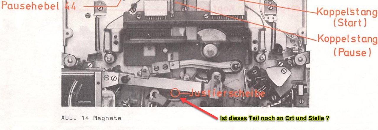 Hallo Manfred, werde mal den Startmagneten neu justieren, denn der Kolben vom Dämpfungszylinder ist nicht herausgerutscht. Geht das justieren auch irgendwie ohne Exzenterschlüssel? Habe nämlich keinen. Ferner werde ich dann auch gleich den Pausemagneten überprüfen und gegebenenfalls auch gleich nachjustieren.