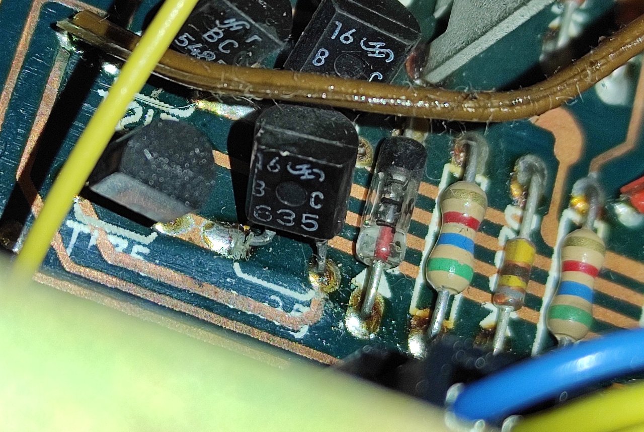 Ich habe angefangen die Schaltung nachzuvollziehen, und direkt der erste Transistor sieht ein bisschen grün aus.. Den werde ich wohl mal ersetzen.