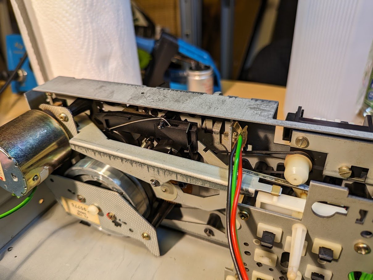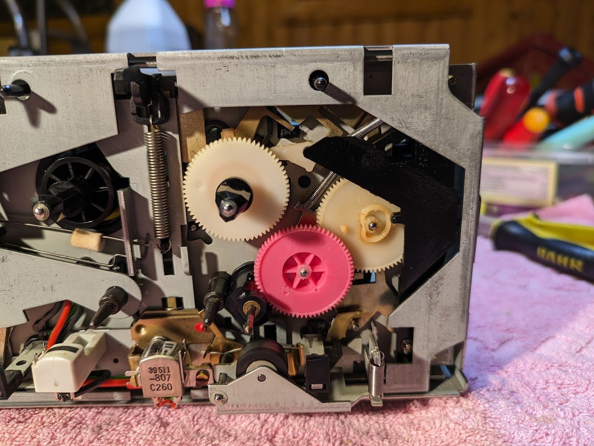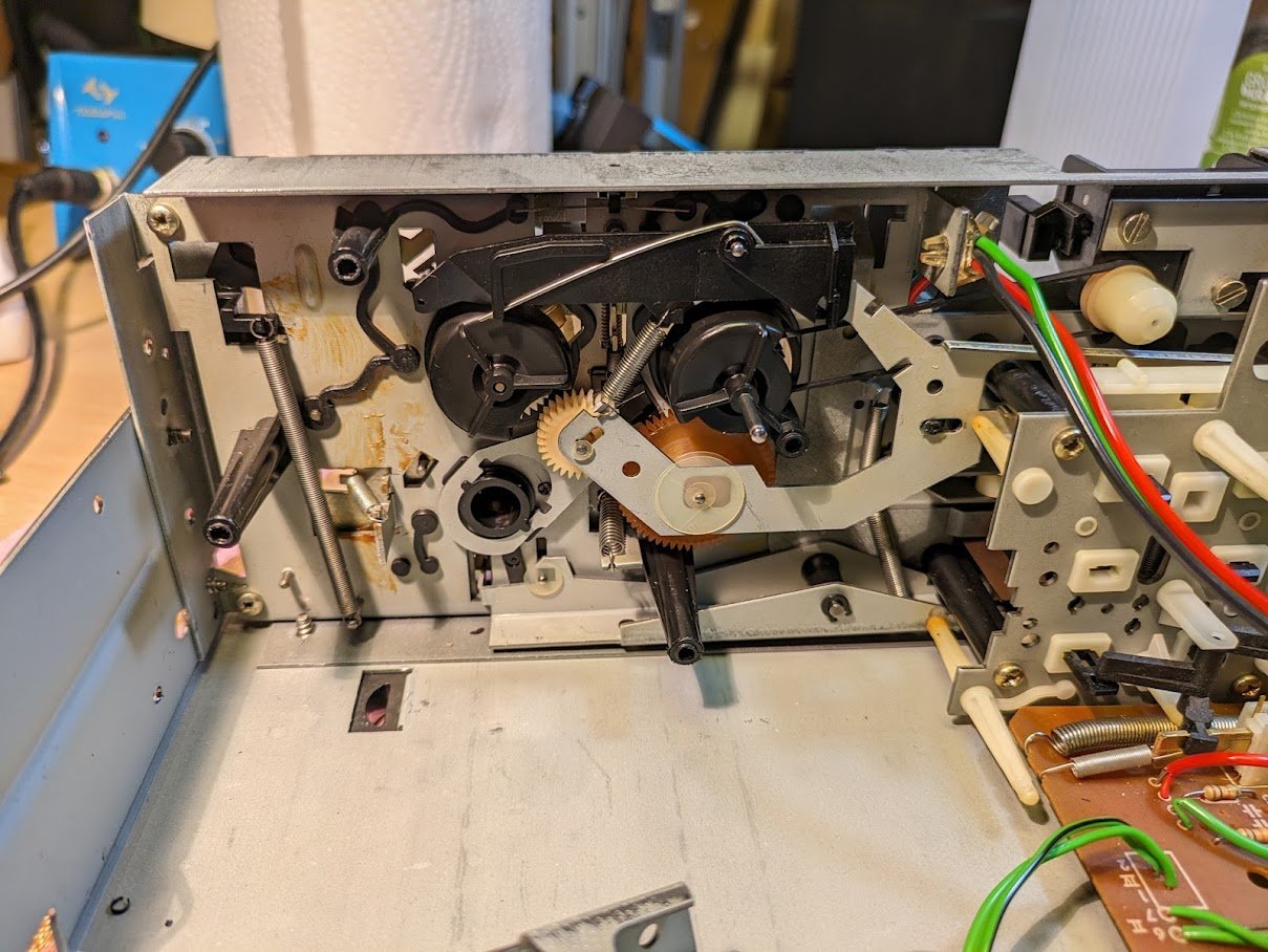 Das Deck spielt zwar wieder vernünftig, bei Spulen (sowohl vor als auch zurück) greifen aber die Zahnräder nicht richtig ineinander, so dass sie nur sehr ungesund übereinander ratschen. Feder falsch eingehängt? Außerdem klackert der Tasthebel da etwas unmotiviert rum, dabei habe ich den Teil vorne gar nicht angefasst.