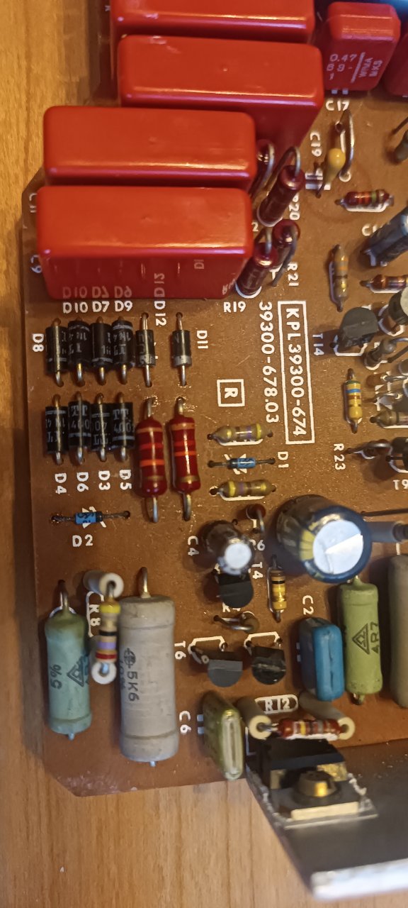 Insgesamt gibt es wohl 3 Ausführungen der R Platine. Version 1 = R3,4 und 5,6 liegend, Original Meßwerte wie im SM. Version 2 = R3,4 und R5,6 stehend, Neue Meßwerte um die 9V im Zusammenhang mit den Optokopplern. Version 3 = Version 2 zusätzlich mit Z Diode anstatt R für den 24V Regler. In Version 2 und 3 wurde auch die Schaltung geändert, so daß man die Werte für R3,4 und R5,6 nicht einfach ändern darf. Die unterschiedlichen Versionen sind auch auf der Bestückungsseite aufgedruckt. Die Ätzseite sieht man ja aber bereits ohne Ausbau der Platine R.